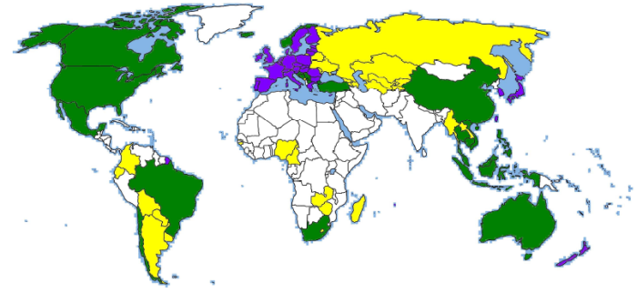 Európában a REACH rendelet kapcsán megvalósult a GHS bevezetése. A térkép lilával jelzi a GHS-t alkalmazó országokat, ezek az EU országok, Japán és Új-Zéland